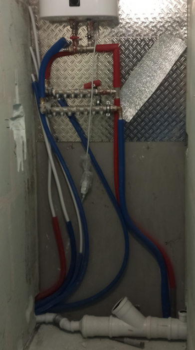 Тут я уже переделал немного узел ввода в квартиру. У меня только ввод ХВС напомню. Сдвинул все это часть как можно левее чтобы все уместилось в модуль 80 см под мойку. Ящеры с гидромира, как всегда про это не в курсе. Поставил маленький коллектор на 2 вывода(мойка и посудомойка, хотя надо было на 3 еще на фильтр чистой воды), тройник - уходит холодная вода в туалет, дальше подача ХВС на котел. Ниже красное это подача ГВС в туалет, тройник на мойку ГВС , подача ГВС с котла. Синяя труба это с туалета пришла холодная вода, ее буду соединять на тройник толстый такой, медной трубой.