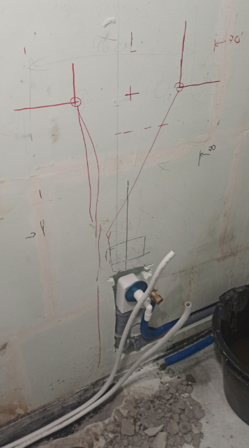 Вот и вывода стиральки. Выше виден прямоугольник карандашом, это место для розеток стиралки и сушки. Хочу внести важное пояснение. Я этого раньше сам не знал. Сушильные машины бывают со сливом в канализацию и без, то есть вы вытаскиваете лоток и сами выливаете в ванну или раковину. Я покупал сушку еще до начала ремонта, выбирал второпях. В итогу купил с лотком, поэтому у меня один вывод из сифона под стиральную машину. Есть такие же сифоны но с двумя выводами.