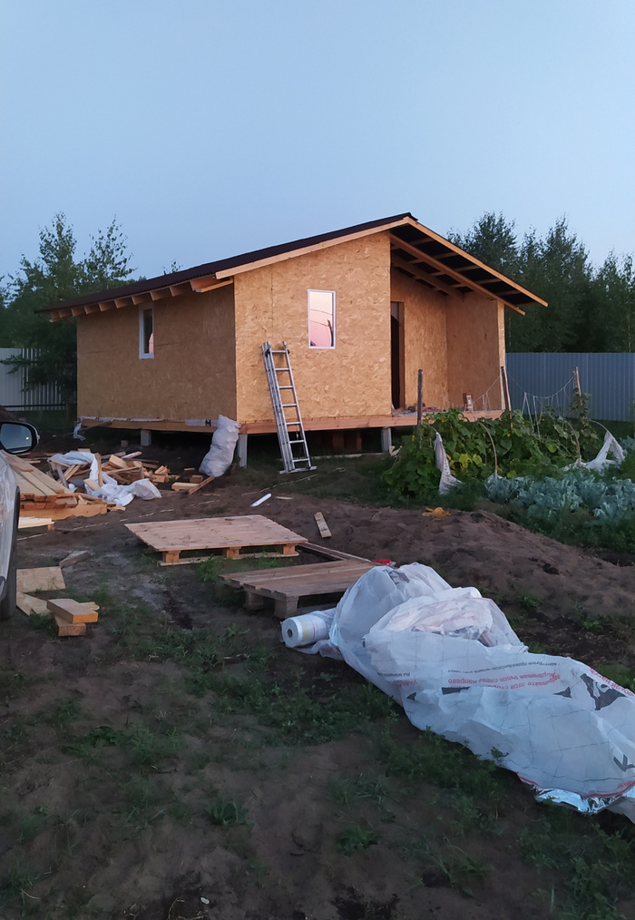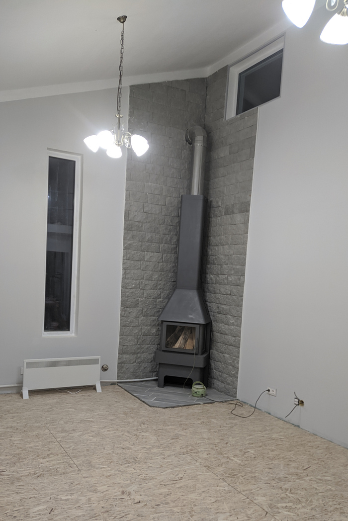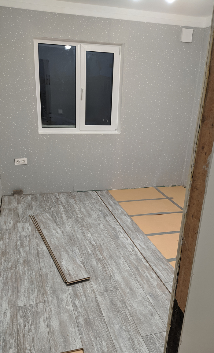 Никто из нас уже не ощущает себя горожанином. Что же, не хотим, значит надо достраиваться и заселяться. Приступаем к работе. На пол осп, на него подложку и ламинат единым контуром. Работа не сложная, поэтому делается достаточно быстро