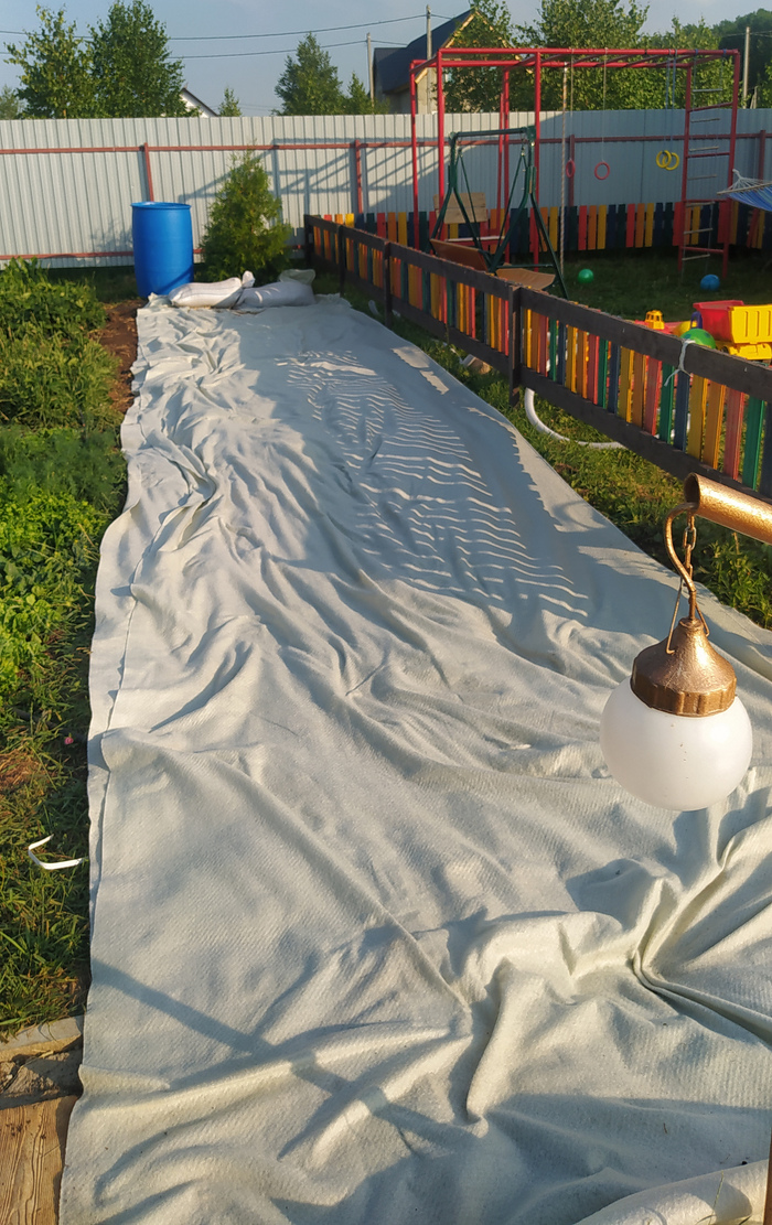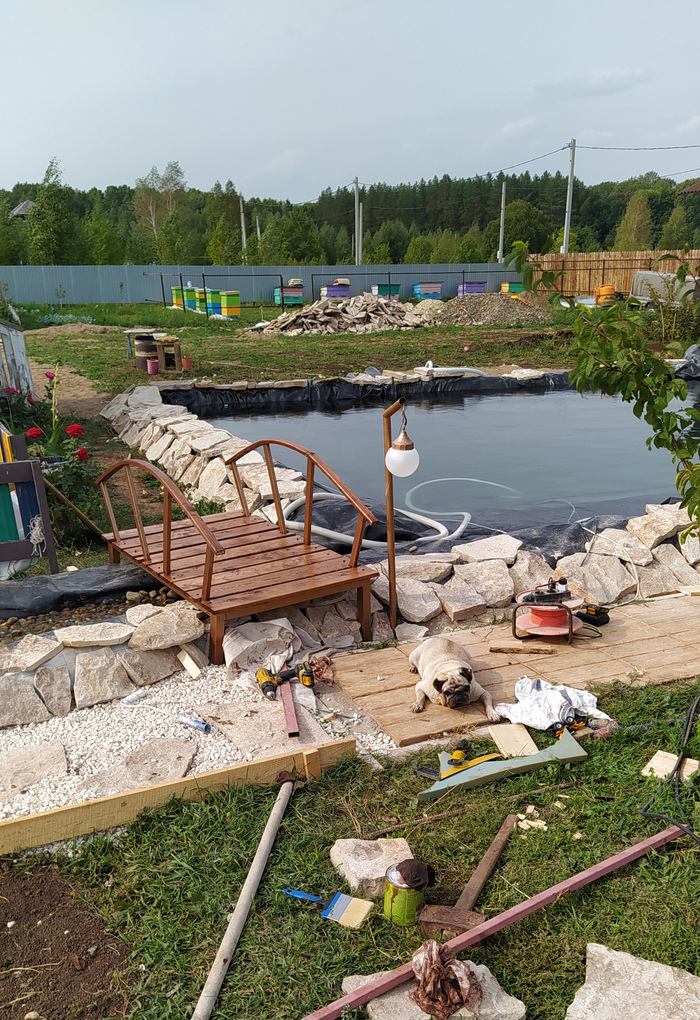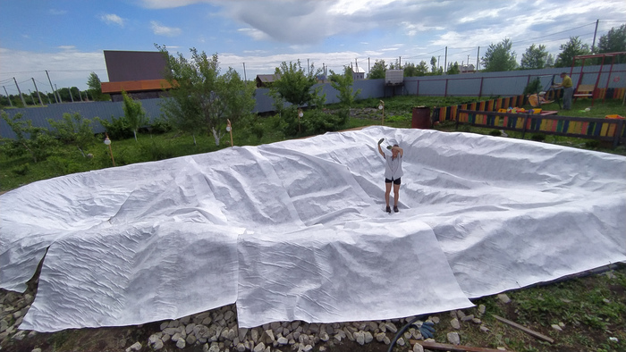 Как наверное уже догадались, скорость работы нашей снизилась еще по одной причине. И всё же, любое движение лучше, чем статика. Так что двигаемся дальше. Лето обещает быть жарким, а значит к этому времени у нас уже должен быть купальный прудик. Негоже в жару страдать. Еще и на лодке не выехать с грудным ребёнком. Из 20тонн гравия делаю борта, укладываю сетку, бетонирую, таскаю мешки с песком для финального выравнивания уровня. Стелим геотекстиль и на него пленку. Заливаем водой и радуемся. Просто, быстро, недорого.