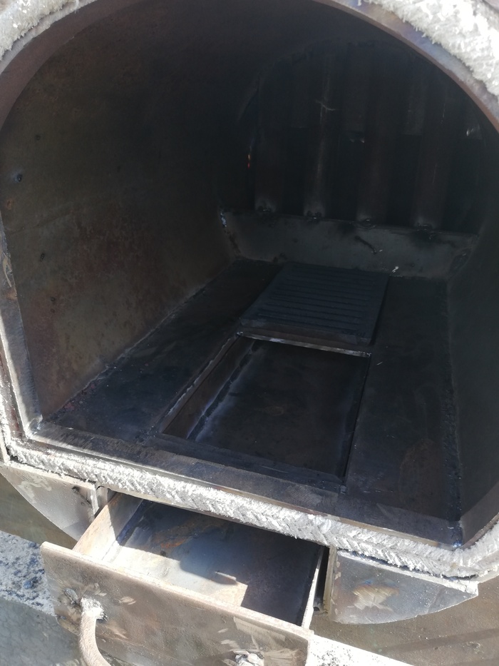 - О! внутри я заморочился: там сделал площадку под колосники, сделал окантовку под дверь, как у промышленных котлов: обечайка из асбестшнура, по периметру двери наварил проволоку шестерку, а механизм закрывания двери взял от фляги. Внутри поставил две отсечки от пламени. Сварил зольник из миллимитровки......Вот эти монёвры, я реально заебался делать: