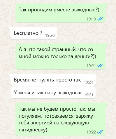 Нормально общались, дала свой номер телефона, дальше переписка в вотсапе. Никаких намёков на деньги или ещё что то не было... и раз, не проститутка