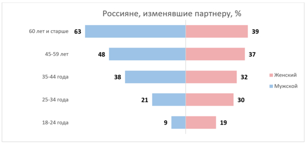 После 35 лет мужские измены преобладают над женскими и продолжают нарастать с возрастом. Причем, если доля женских измен после 35 лет растет незначительно (или женщины старше 35 лет реже готовы признаваться в этом), то доля мужских измен в сопоставимый период растет.