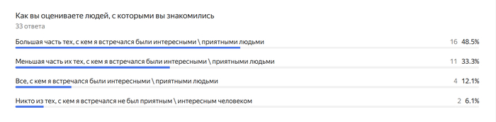 Мужчины оказались менее расположены к своим собеседницам. Вариант "Никто из тех, с кем встречался не был приятен" выбирали только они. Вариант "меньшая часть была приятной" выбирали почти исключительно мужчины. Хотя в целом и те и другие большую часть встреченных людей оценили позитивно. А по срачам в интернете так и не скажешь)