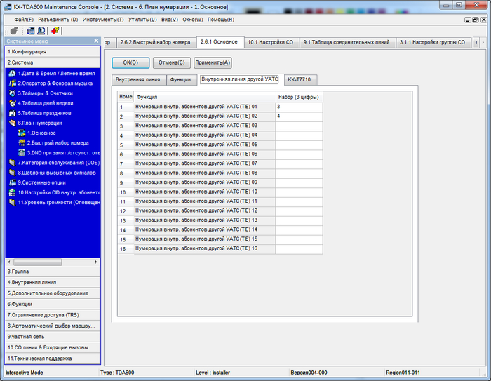 2.4 Идём в пункт "2.6.1Numbering Plan, Main", (План нумерации, Основное) на вкладку "Other PBX Extension" (Внутренняя линия другой УАТС), пишем первую цифру нумерации Asterisk (у меня - 3 и 4 соответственно). ВАЖНО, чтобы строка была та же, что и в пункте 9.1.