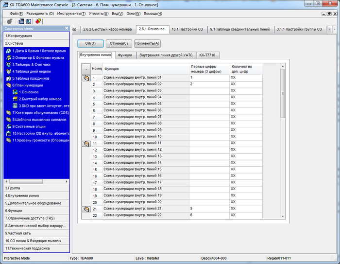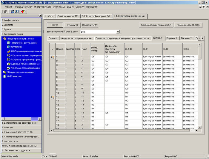 Но номерной план сбит. У нас были трёхзначные номера от 100 до 212 (7 плат внутренних абонентов по 16 номеров). По умолчанию же АТС выставляет четырёхзначные 1001-1112.