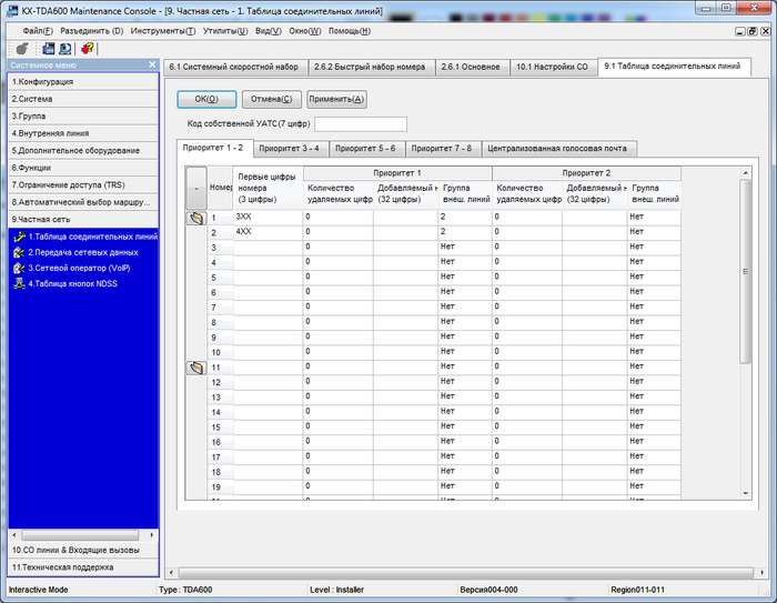 Я поставил всем 2.2.2. Объявляем эту транковую группу локальной (в том смысле, что не "внешней") для данной АТС. Для этого идем в пункт "9.1" (TIE Table). Думаем что бы написать в графе "Leading Number". Это такие цифры, при наборе которых АТС будет "отдавать" звонок в транковую группу, то есть нам на астериск. Тогда в Leading Number я пишу "3XX" и "4XX". В графе "Trunk Group" ("Группа внешних линий") указываем тот номер, который мы задали на предыдущем шаге, в пункте 10.1 консоли. При этом запоминаем номер строки таблицы, в который мы все это вписали (!). Это важно!