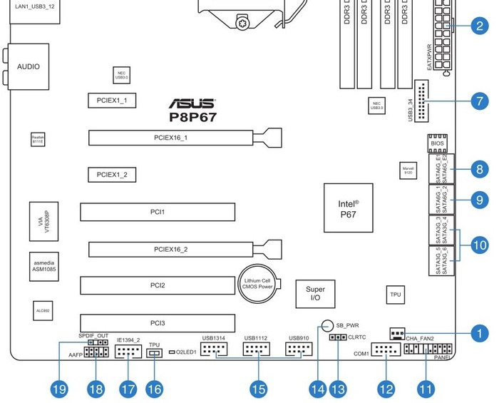 Качаем руководство на материнскую плату и находим разъёмы контроллера на ней (8).