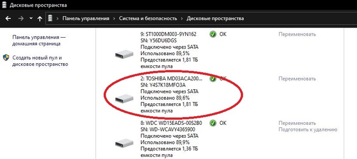 А вот он в Storage Spaces. На нём хранится много данных и перед его удалением придётся найти ему замену. Данные в процессе подготовки к удалению, убудут перемещены автоматически.