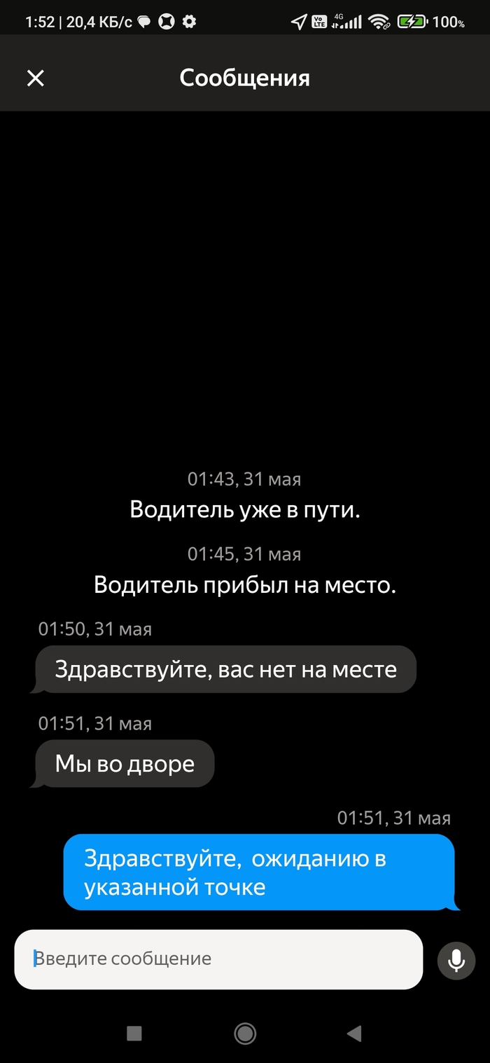 Я: К сожалению ещё нет. Я сейчас выполняю другой заказ, и чат с вами будет доступен только по завершению текущей поездки, извините.