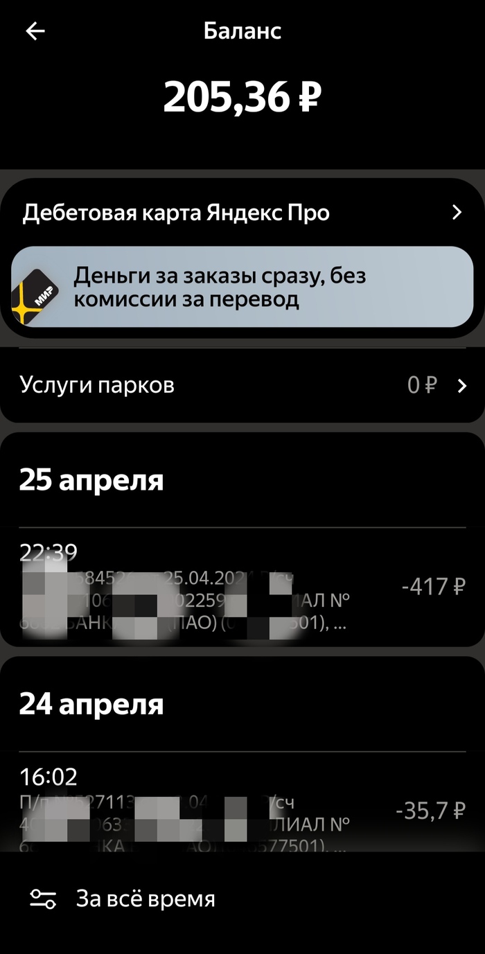 Так. Дальше по порядку идти если, то Яндекс в следующие рабочие сутки с баланса Я.Про переводит деньги мне на карту. Похоже вот тут и происходит магия. Ведь не может Яндекс из своего кармана мне доплачивать за пользователя, поэтому и переводит фактическую сумму, а долг остаётся висеть на балансе. Как сможет списать с карты так и спишет. Не сможет, то так и будет висеть. И висит: