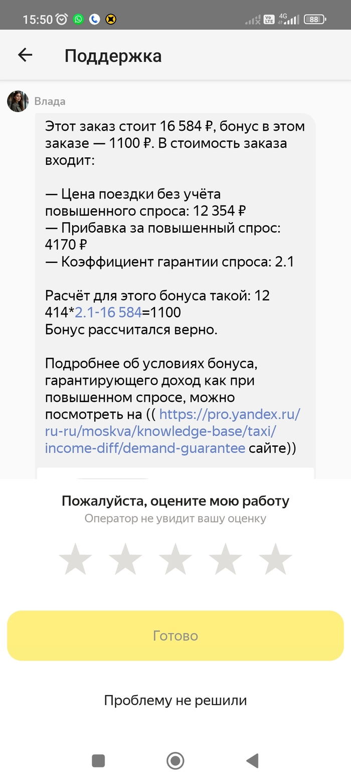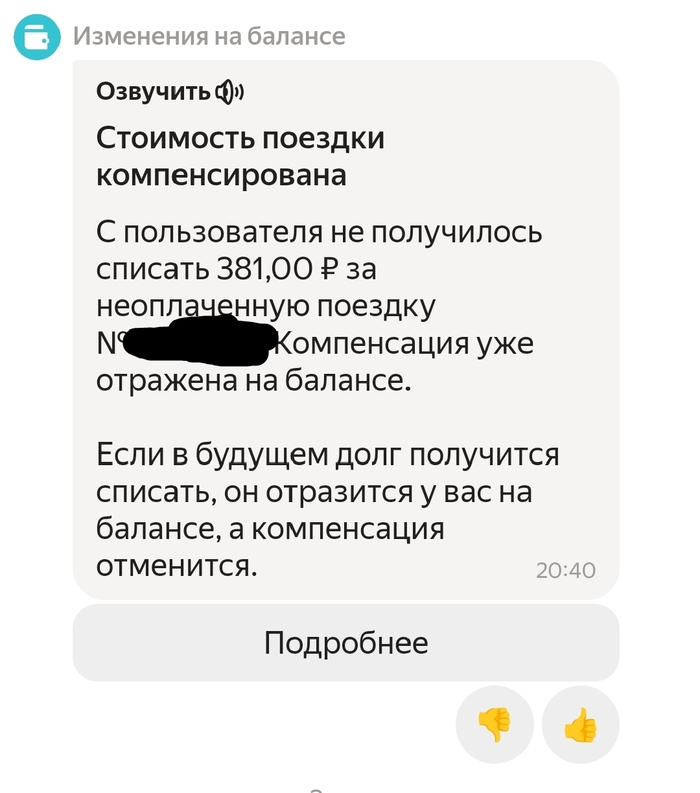 Подрабатываю в Яндекс такси два дня в неделю в среднем. И был такой заказ у меня не далее чем 28 июня. Приехал на адрес, подождал пассажиров, ребята сели, мы тронулись, и заказ переключился на наличные, обычное дело, часто бывает по утрам. Но парень говорит, наверное мы тогда выйдем (видимо думал что до конца поездки система не увидит подвоха, что у него нет денег на карте), я ему говорю, тогда отмените поездку (у меня кнопки "отмена" после начала поездки уже нет, а если я завершу поездку с меня спишут комиссию). Пассажир сказал ок и они ушли. А у меня активный заказ, заказ должен был стоить 500 рублей где то, но я не успел уехать с точки подачи, завернул лишь в арку. Пишу поддержке, мол так мол и так, ушли не заплатив и не отменив, поддержка мне написала, мол сами завершите и напишите нам.
