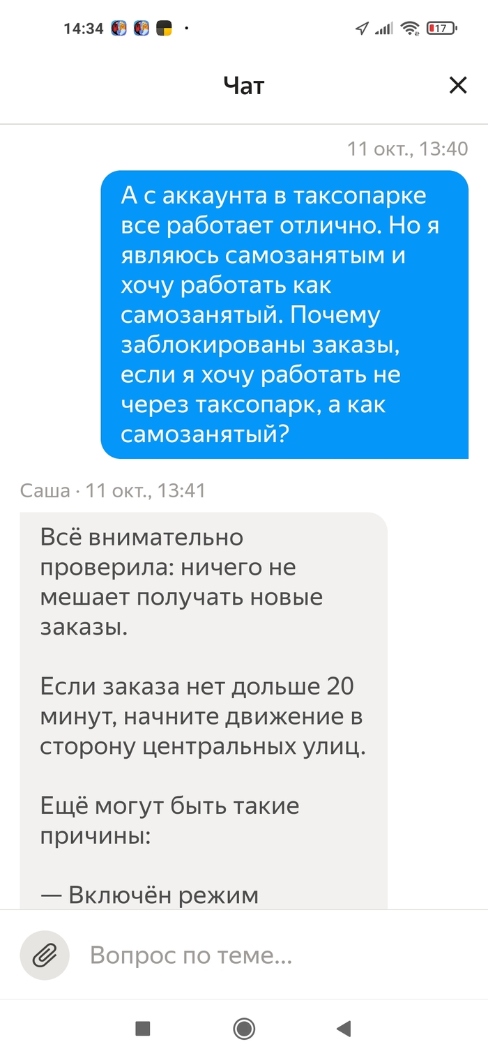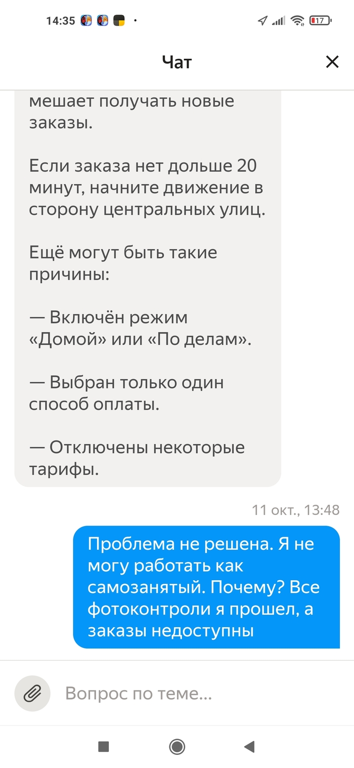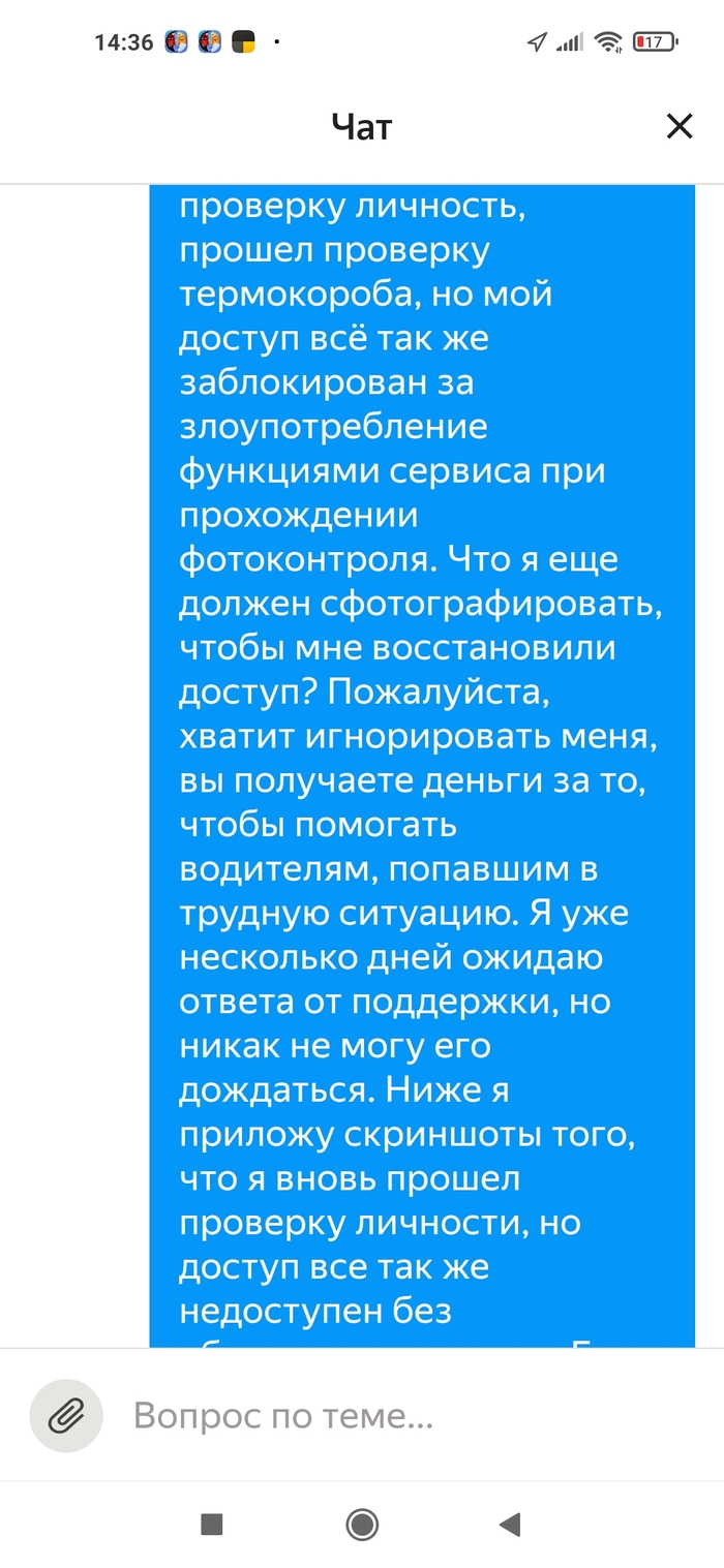 Я решил написать в поддержку через автопарк, в который я изначально устроился (отработал там дня 2, чтобы посмотреть, как там вообще с заказами и с деньгами. Когда всё устроило, я устроился в Яндекс.Доставку уже как самозанятый). Описал всю проблему, что доступ на самозанятом закрыт (а через автопарк, кстати, открыт). Робот ответил, что доступ открыт и всё в порядке. Я перепроверил, доступ всё так же закрыт. И после этого меня просто начали игнорировать. Уже 6 дней я не могу получить хоть какой-то внятный ответ о причинах блокировки и о том, как ее снять. Я бы съездил в офис поддержки, но увы, в Екатеринбурге его закрыли в августе. Кстати, когда его закрыли, то на сайте написали, что теперь все сотрудники будут в тех. поддержке и от этого она станет ещё эффективнее. Иронично.