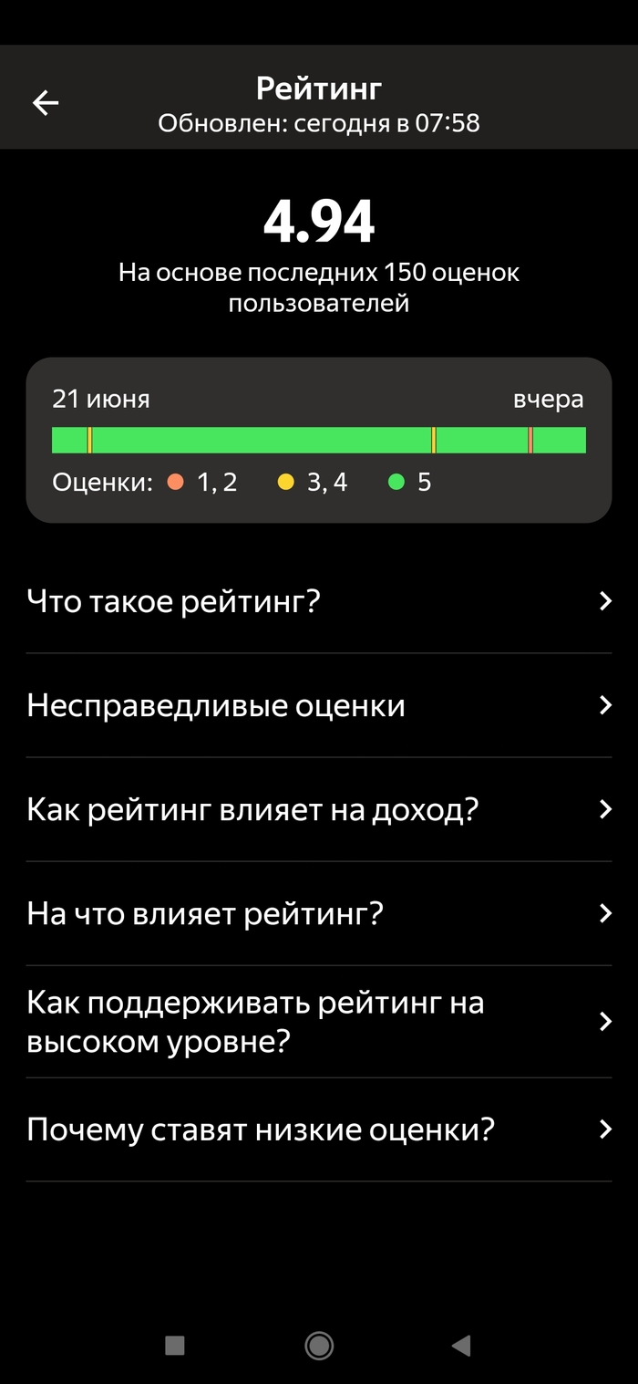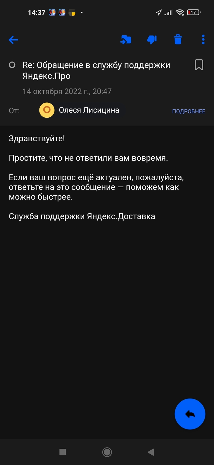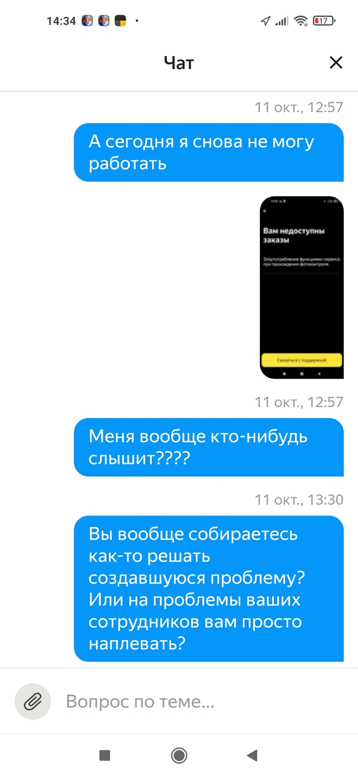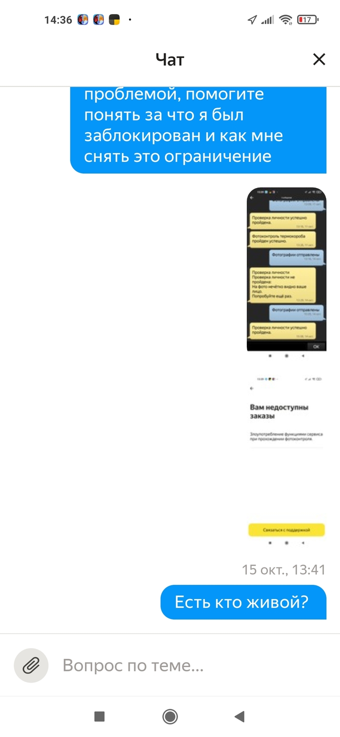 Я решил написать в поддержку через автопарк, в который я изначально устроился (отработал там дня 2, чтобы посмотреть, как там вообще с заказами и с деньгами. Когда всё устроило, я устроился в Яндекс.Доставку уже как самозанятый). Описал всю проблему, что доступ на самозанятом закрыт (а через автопарк, кстати, открыт). Робот ответил, что доступ открыт и всё в порядке. Я перепроверил, доступ всё так же закрыт. И после этого меня просто начали игнорировать. Уже 6 дней я не могу получить хоть какой-то внятный ответ о причинах блокировки и о том, как ее снять. Я бы съездил в офис поддержки, но увы, в Екатеринбурге его закрыли в августе. Кстати, когда его закрыли, то на сайте написали, что теперь все сотрудники будут в тех. поддержке и от этого она станет ещё эффективнее. Иронично.