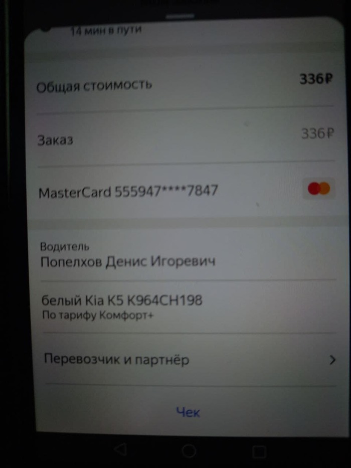 Второе, я никогда не заказываю комфорт+, только комфорт, а когда с женой эконом ( она экономная и требует чтобы я не выпендировался), те даже если допустить что я все таки сделал заказ и как то нажал кнопку, должен был приехать комфорт и даже если приехал K+ в тарифе бы стоял комфорт. И еще сумма списания 336 как раз и говорит, что водитель, получил заказ именно по K+ , никто не вышел и он сделал отмену и списалась подача 199 рублей + за платное ожидание. Есть правда ньанс, если бы водитель сделал именно так, то я не смог бы поставить ему оценку, а у меня стоит что поездка состоялась, поэтому косяк водителя есть тоже.