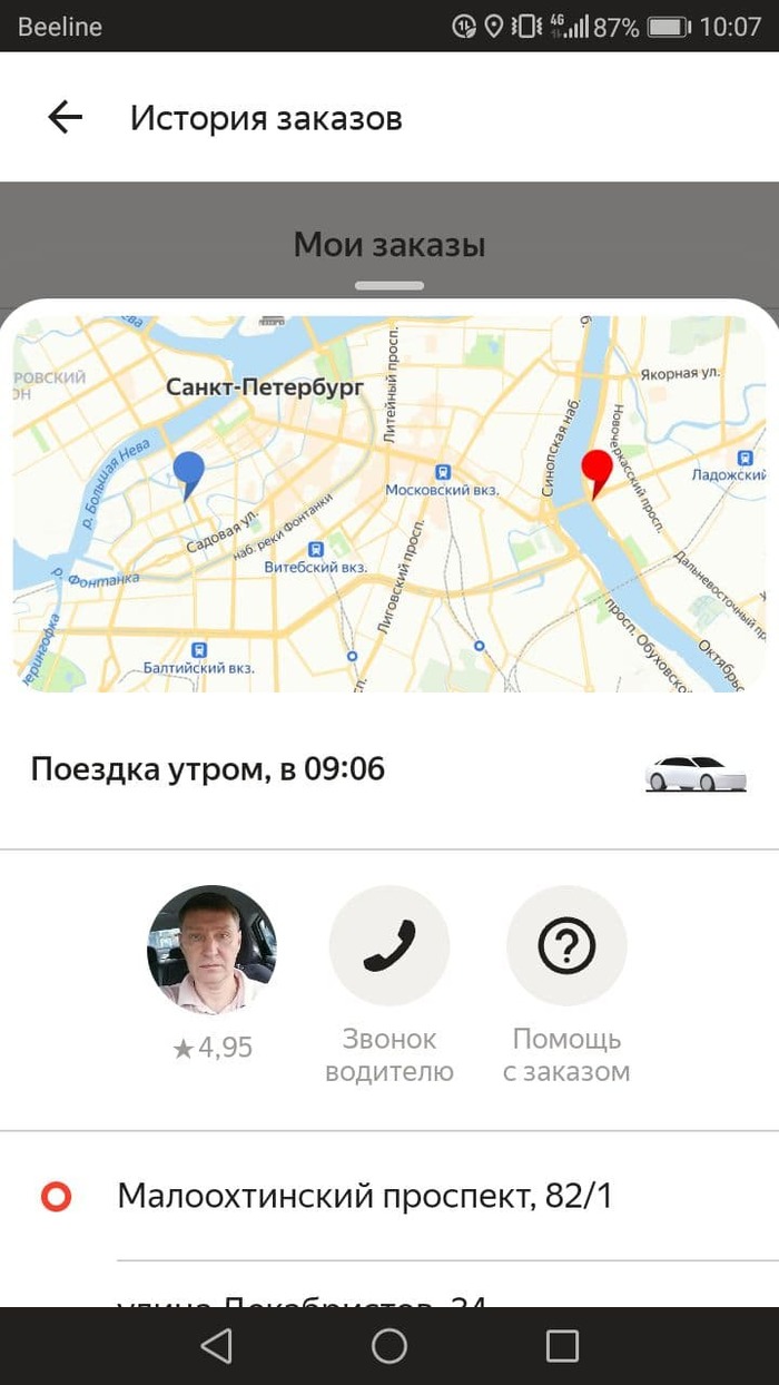 Какого же было мое удивление когда примерно в 9-10 я увидел пуш от Альфа-Банка что у меня списано 712 рублей Яндекс.Такси, я подумал что жена взяла такси до работы, а так как ее карта привязана к моему счету , что и моя, то когда она делает покупки я вижу их, но позвонив супруге она сказала что добиралась как обычно на метро и зайдя в приложение Альфа Банка я увидел что списание было с моей карты и я полез в приложение Яндекс. Такси ( оно стоит на другом телефоне) и что же я вижу, я выполнил только что поездку с Малоохтинского 82 до Декабристов 34 , причем поездка в час пик ( 8 баллов на тот момент) по этому маршруту длилась 14 мину и внимание она стоила 336 рублей, а списалось по карте 712 рублей.