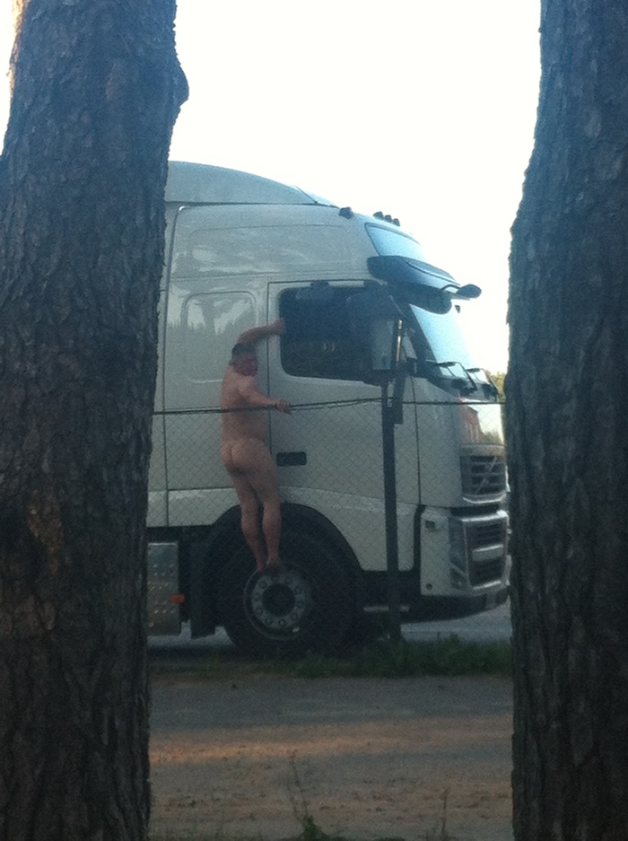 Прошёл через мостик, потом вдоль цепи стоящих фур и стал лезть в одну из них в салон.