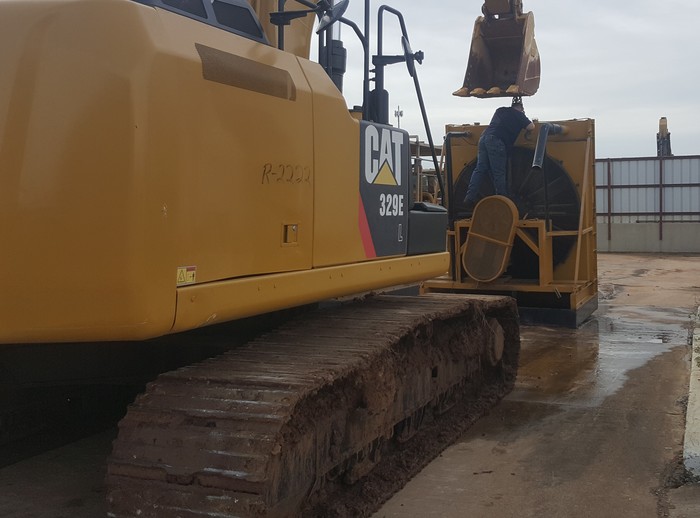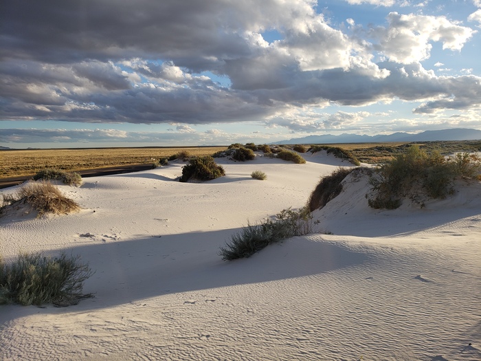 Пустыня с белым-белым песком. Поскольку солнце садилось - песок получился малость с желтым оттенком. На фото - мой трак и груз под брезентом. Шесть электропогрузчиков