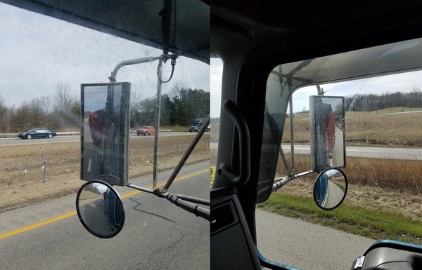 Вид из кабины по зеркалам. Видно что справа я прижимаюсь, а слева груз все же достает разметки. Неудобство было только в том, что не видно было кто едет сзади. Вроде не критично. При перевозке широких грузов, если нету видимости за грузом более 50 метров, требуются дополнительные зеркала.