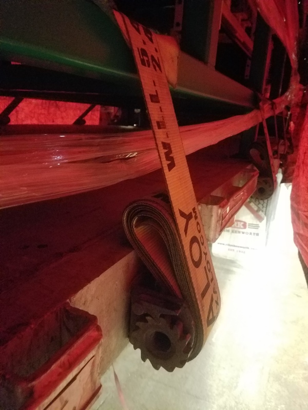 Крепим груз такими вот "ремнями". Не знаю правильного обозначения на русском языке, но в США они зовутся стрэпами. Цепями запретили, чтоб не поцарапать груз. Да он и не тяжелый, так-что крепим так и накрываем брезентом