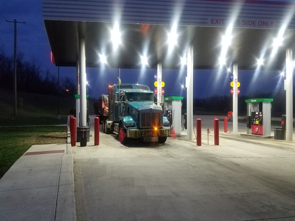 Вечерело. И время заправки. Такой груз спокойно проезжал колонки, так что с заправкой проблем не было. Оказалось можно ехать в ночное время по двум штатам. Дело в том, что негабаритам разрешено ехать еще 30 минут после захода солнца. В ночное время - стоянка. Ну от штатов зависит и груза, но в основном так.