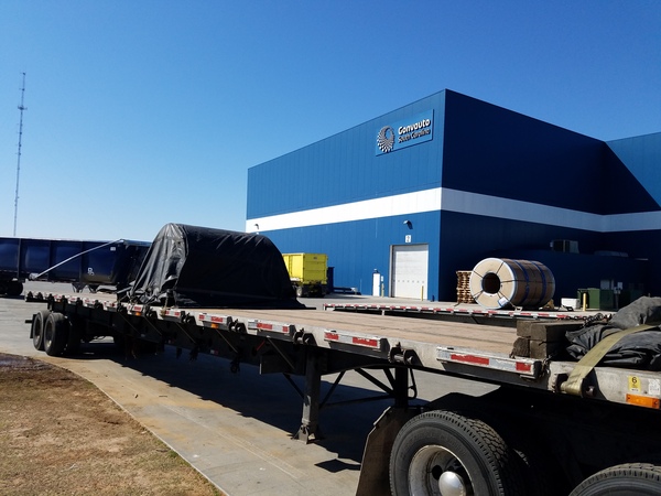 Груз закреплен цепями и накрыт. На заднем плане можно увидеть как выглядит рулон металла