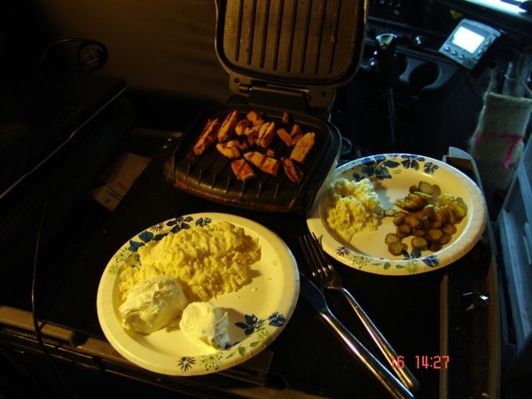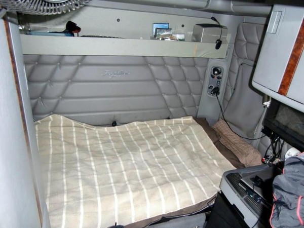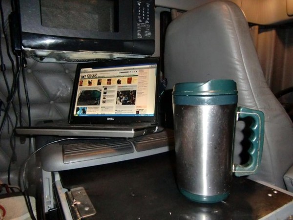 Перед этим , подёргав за стропы, крепящие груз, убедился, что всё затянуто и трубы на месте. Если стропы ослабнут, при резком торможении трубы двинутся вперёд, прецедент был. Всё на месте, ничего не спёрли и лишнего не положили.К этому времени заваривается чай. Делается пара-тройка-четвёрка бутербродов и начинается веселье в форме завтрака.В траке я провожу дней шесть из семи, поэтому он максимально приспособлен для минимума комфорта: микроволновка, холодильник, чайник, электросковородка, гриль, тостер, автономные обогреватель, кондиционер. Летом вожу барбекюшницу- встретиться с товарищем в дороге, организовать вечером барбекю под пиво- маленькая радость жизни.Когда с утра время есть (как сегодня) во время завтрака можно залезть в интернет, если со временем напряжёнка- приходится жевать в процессе работы.