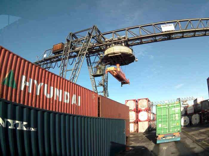 В этом порту я еще не был ни разу, впервые. Паркинг машин на 10, здание офиса небольшое. Зашел внутрь, там пару человек стоит, русская речь слышна, расспросил что и как и, заполнив свои данные, получил в офисе тикет на получение. На въезде стоит чекер, спросил у него, куда мне ехать, у меня 21ое место. Он показал - до конца, потом два раза на лево и смотри на земле метки. Ок, прикатил я на свое место, передо мной коллега получал свой контейнер, грузил ему речной кран, да и места для трактора-погрузчика здесь небыло, все слишком узко, маленький терминал. Кран взял пустую 40-ку и поставил мне на раму, очереди сзади не было, поэтому я прямо на месте и закрепил замки, что бы потом не оставливаться.