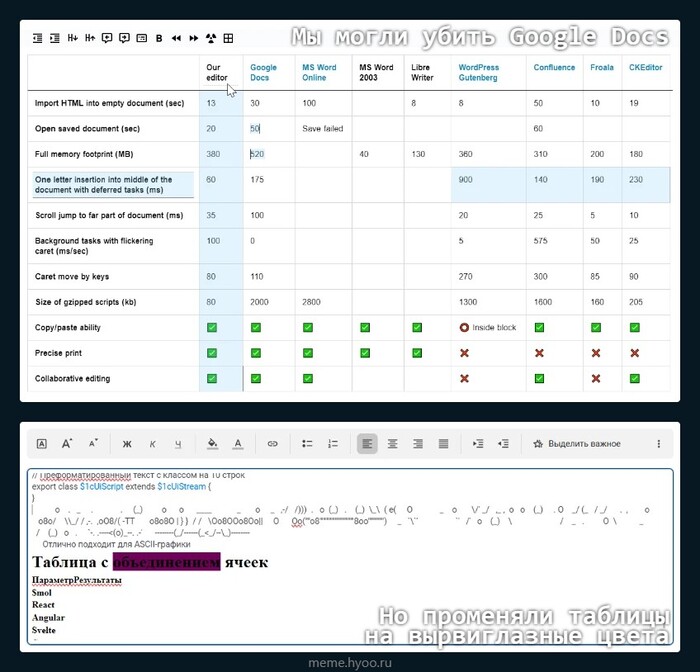 Драматичности истории через пару лет добавит внезапно начавшаяся огульная русофобия и торговые санкции, из-за чего всем российским компани придётся срочно искать российские аналоги западным сервисам. Тут бы свой мощный веб-редактор очень бы пригодился. Но придётся всем жевать беспалевный форк OnlyOffice.
