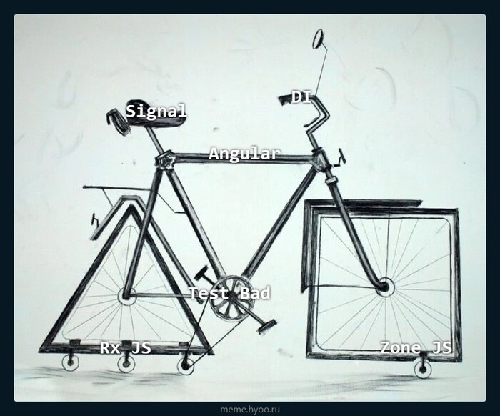 А самое главное — собралось хоть и небольшое, но сообщество заинтересованных в этом всём разработчиков. Появляются сторонние коммерческие проекты. Часть успешных историй можно найти на этой странице. Кто-то занял призовое место в Хакатоне. Кто-то запилил проект на работе, пока начальник моргнул. А кто-то работает фултайм $mol-разработчиком, отказавшись даже от большей зарплаты на React. Свои нервы дороже. После $mol пересаживаться на то, что сейчас популярно в индустрии — это как с квадроцикла пересаживаться на одноколёсный велосипед... без сиденья... с треугольными колёсами. Ездить-то можно, но... есть нюанс.