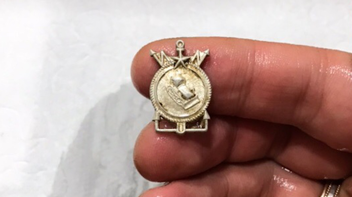 Перекусили, идем дальше. В 20-ти метрах от нашей столовой находим опознавательные знаки того человека, который здесь был до нас. Вот такой вот значок выскочил аккурат на старой тропинке. Я так понимаю советский.