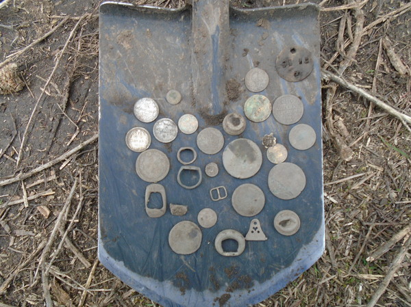 Пройдя около 2-х сотен метров вдоль кромки леса, мы нашли относительно старую дорогу. Судя по находкам ей пользовались на заре СССР. Вездесущего мусора и водочных пробок на ней почти не было, а монеты стали выскакивать с приятной периодичностью.