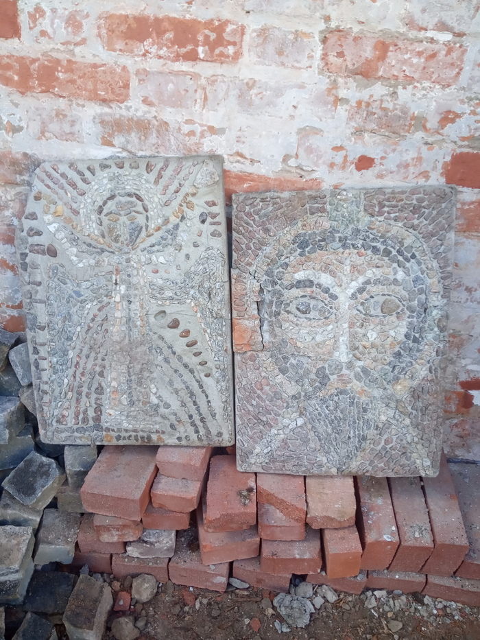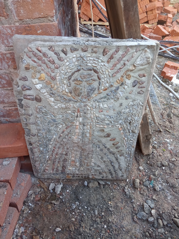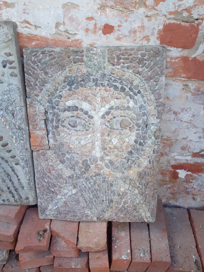 Нашли в монастыре в стеновых (фланкирующих) башнях при разборке полов первого яруса. Размер 500*700 мм. Толщина 30 мм. Основание из раствора, армирование проволокой типа катанка диаметром приблизительно 5 мм. Далее выложено камушками.