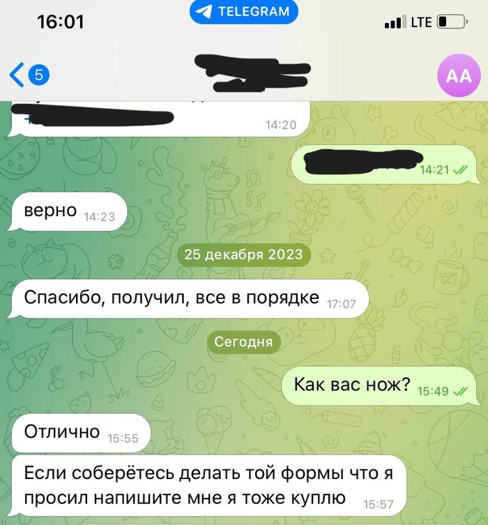 Прошу прощения, что столько написал, но захотелось высказаться, потому-что столько негатива услышать в свою сторону тяжело. Можете считать меня отвратительным мастером, который делает говно руками мигрантов - Ваше право, но я все-равно стараюсь на пределе своих возможностей. И довольные клиенты того стоят. Я мог бы полностью перейти на оптовые продажи, делать только ножи на амазон, но там нет самого главного: общения с клиентом. А мне нравится слушать, как мой нож приносит радость. И не какому-то Джимми на той стороне планеты, а моему же соотечественнику.
