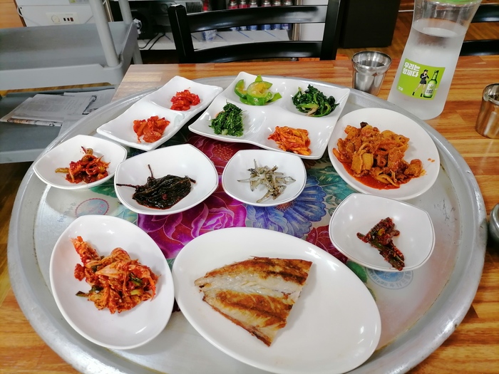 Среди закусок обычно корейские традиционные овощи, маринады, мелкая сушеная рыба и кимчи. Вариант закусок, как правило, зависит от местности - где рядом море, там больше связанного с морем, ну а где моря под боком нет - больше разных травок и овощей.