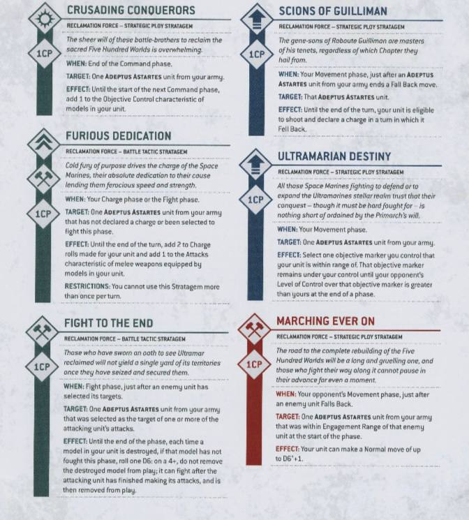 Стратагемы на удивление хороши. Все юзабельны и нет откровенно плохих. Что важно в каждой стратагемы написано, что баф может получить юнит Adeptus Astartes это значит, что даже техника, пехота и так далее могут быть целью стратки без исключения, что как по мне отлично 👍