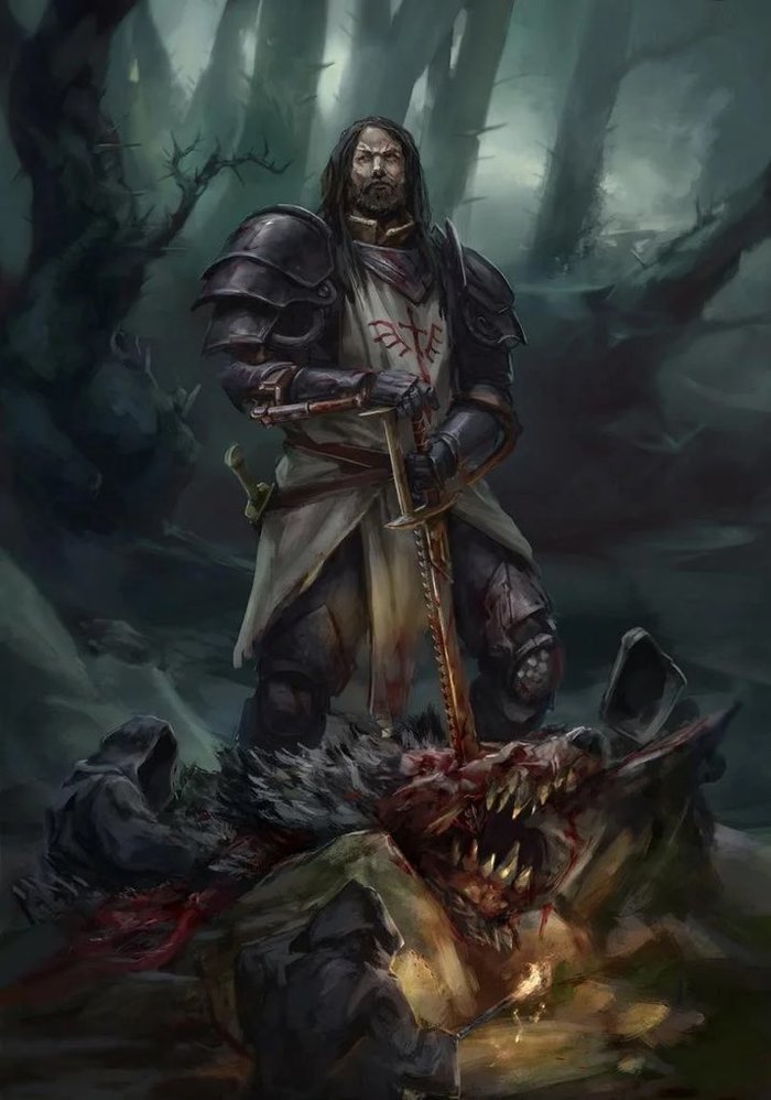 Псайкерством Захариил одолел животное, просто засунув руку по плечо в грудную клетку и раздавив сердце, и залутал, потратив зуб на крутой меч. Калибанского Льва описали во всех красках, как он вонял и всё такое, так что понимаем – нурглятина, и планета явно истекает варповой заразой, раз этих зверей так много. Но примечателен читателю этот эпизод не геройством, а последующей встречей: Захариила встречают Смотрящие во Тьме. Это такие невысокие создания в капюшонах, чьи лица скрыты во тьме, и только глаза сверкают из тени. Это воплощения куда более могучих существ, разделяющих бытие как в материуме, так и в варпе, и простой людишка, если ему случится увидеть, что там под капюшоном, просто сойдёт с ума и помрёт, всё. Эти Смотрящие предупредили Захариила, что его силы – это не игрушка, и пользоваться ими опасно, и вообще собирались замочить колдуна вонючего. Но по итогу пощадили, и Захариил вернулся героем, стал полноправным рыцарем и взрослым дядькой. Детство на этом заканчивается.