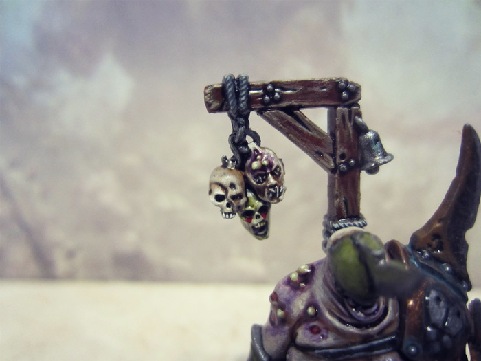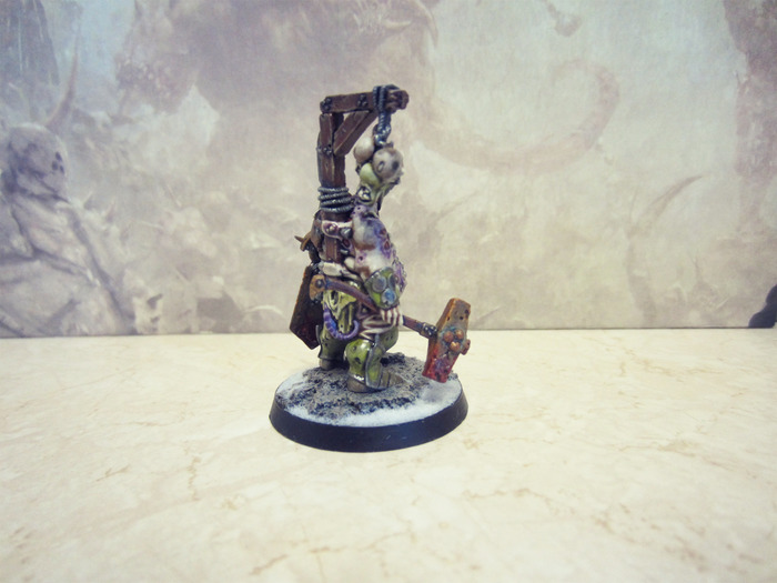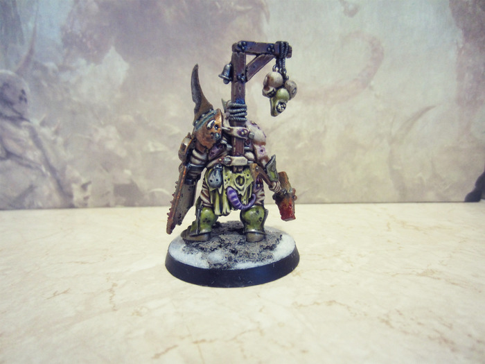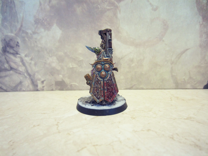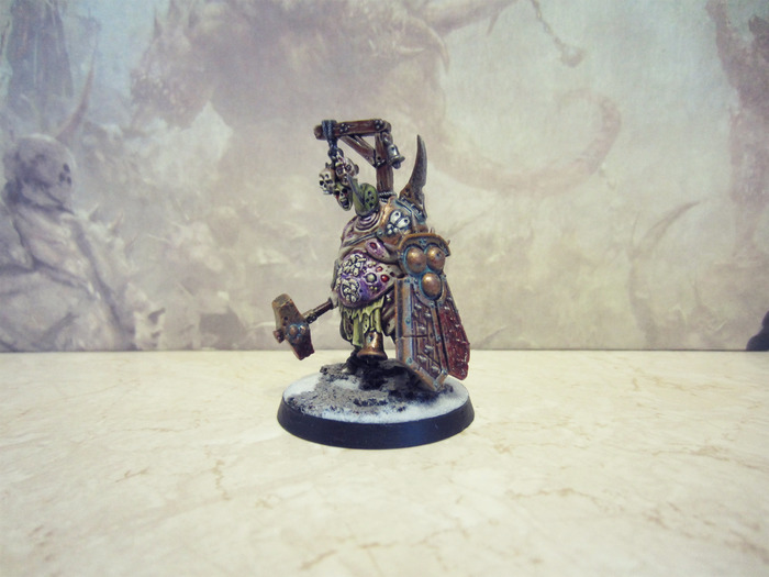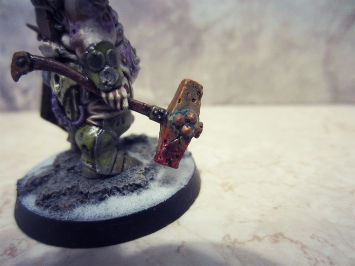Уж очень сильно меня зацепила эта миниатюра, особенно этот молот и щит. Изменил шлем и красил миниатюру примерно три дня. Впервые попробовал текстурную краску крови Blood for the Blood god, очень неплохо смотрится.