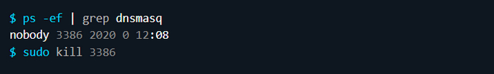 В завершение необходимо убедиться в том, что dnsmasq не запущен, потому что он слушает порт 53. В противном случае ваши DNS-серверы не смогут работать, так как они должны использовать именно этот порт. Если процесс dnsmasq запущен, завершите его по ID: