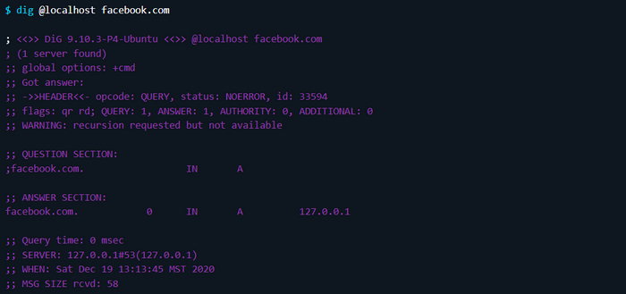 Запустив сервер, можно протестировать его с помощью dig. Убедитесь, что имя хоста, для которого выполняются запросы, разрешается в 127.0.0.1. Это будет означать, что все работает как надо: