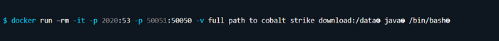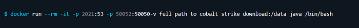 Эта команда выполняет несколько действий. С ее помощью вы сообщаете Docker о необходимости удаления контейнера после выхода, а также о том, что после запуска будете с ним взаимодействовать. Далее идет сопоставление порта 2020 системы хоста с портом 53 в контейнере и порта 50051 с портом 50050. Затем каталог, содержащий архив Cobalt Strike, сопоставляется с каталогом данных в контейнере. Здесь можно указать любое имя каталога, и Docker без проблем его создаст. В завершение предоставляется образ, который нужно использовать (в данном случае Java), а также команда для выполнения при запуске.