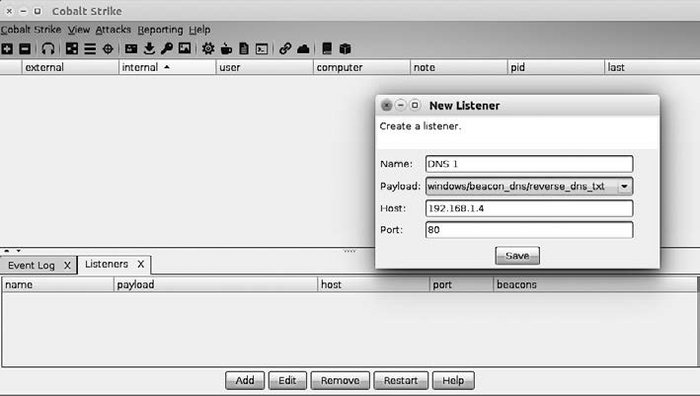 Успешно завершив подключение к двум коллективным серверам, пора запустить два DNS-слушателя. Для создания слушателя выберите в меню пункт Configure Listeners. Он обозначен значком с изображением наушников. Из этого меню выберите Add, чтобы вызвать окно NewListener. Введите в нем следующее: