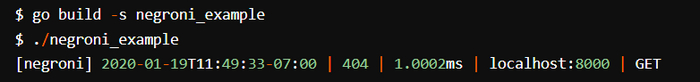 Сейчас же мы создадим сервер из Примера использования Negroni и запустим его. Затем отправим ему веб-запросы по адресу http://localhost:8000. В результате программа логирования negroni должна вывести информацию в stdout, как показано далее. В выводе отражены временная метка, код ответа, время обработки, хост и HTTP-метод: