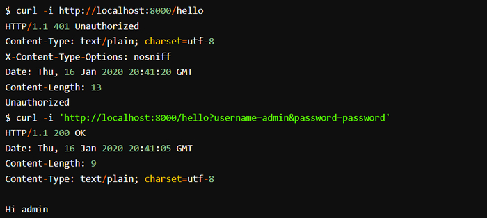 Выполните сборку и запустите код Использования context в обработчиках, а затем отправьте несколько запросов на сервер. Попробуйте использовать как верные, так и неверные учетные данные. Вывод должен получиться следующим: