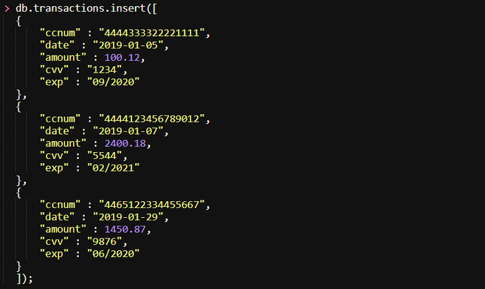 В коде ниже мы вставляем массив документов в коллекцию 𝘁𝗿𝗮𝗻𝘀𝗮𝗰𝘁𝗶𝗼𝗻𝘀. (Все листинги кода находятся в корне /𝗲𝘅𝗶𝘀𝘁 репозитория 𝗵𝘁𝘁𝗽𝘀://𝗴𝗶𝘁𝗵𝘂𝗯.𝗰𝗼𝗺/𝗯𝗹𝗮𝗰𝗸𝗵𝗮𝘁-𝗴𝗼/𝗯𝗵𝗴/.)