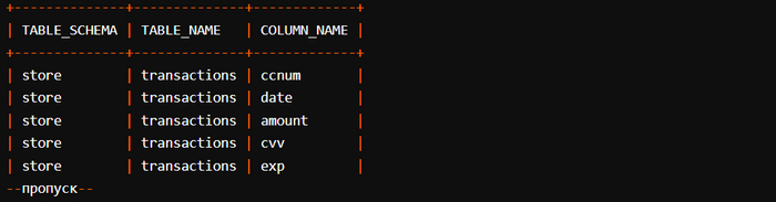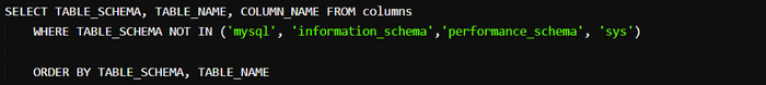 Чтобы реализация 𝗠𝘆𝗦𝗤𝗟 заработала, мы будем проверять таблицу 𝗶𝗻𝗳𝗼𝗿𝗺𝗮𝘁𝗶𝗼𝗻_𝘀𝗰𝗵𝗲𝗺𝗮.𝗰𝗼𝗹𝘂𝗺𝗻𝘀. Она содержит метаданные обо всех базах данных и их структурах, включая таблицы и имена столбцов. Чтобы максимально упростить потребление данных, используйте приведенный далее 𝗦𝗤𝗟-запрос. Он удалит информацию о некоторых из встроенных БД 𝗠𝘆𝗦𝗤𝗟, не имеющих для нас значения: