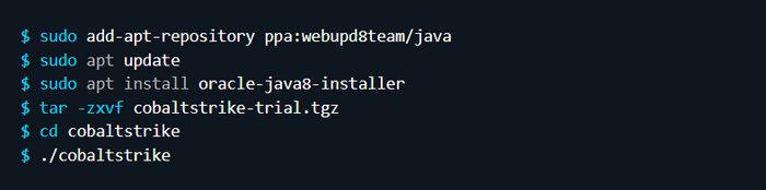 Далее откройте новое окно терминала в хосте Ubuntu и перейдите в каталог с архивом Cobalt Strike. Выполните следующие команды для установки Java и запуска клиента Cobalt Strike: