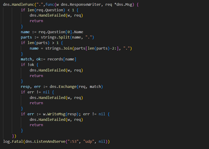 Код начинается с вызова HandleFunc(), он во многом напоминает пакет net/http. Первый аргумент функции является шаблоном запроса для сопоставления. Он станет применяться для указания DNS-серверам, какие запросы будут обрабатываться переданной функцией. Используя точку, мы сообщаем серверу, что предоставляемая во втором аргументе функция будет обрабатывать все запросы.