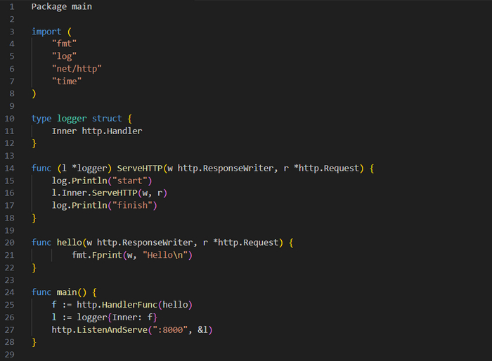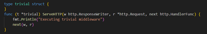 Небольшое различие здесь в том, что интерфейс negroni.Handler ожидает реализации метода ServeHTTP(), который получает уже не два, а три параметра: http.ResponseWriter, *http.Request и http.HandlerFunc. Параметр http.HandlerFunc представляет следующую промежуточную функцию в цепочке, которую мы назовем next. Сначала обработка выполняется методом ServeHTTP(), после чего происходит вызов next(), которой передаются изначально полученные значения http.ResponseWriter и *http.Request. В результате выполнение передается дальше по цепочке.