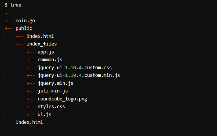 Эта команда запускает экземпляр Roundcube Docker. Перейдя по адресу http://127.0.0.1:80, вы увидите форму авторизации. Обычно для клонирования сайта и всех необходимых ему файлов используется wget, но задействованный в реализации Roundcube JavaScript лишает нас этой возможности. Вместо этого применим для сохранения Google Chrome. Структура каталога примера приведена в коде ниже.